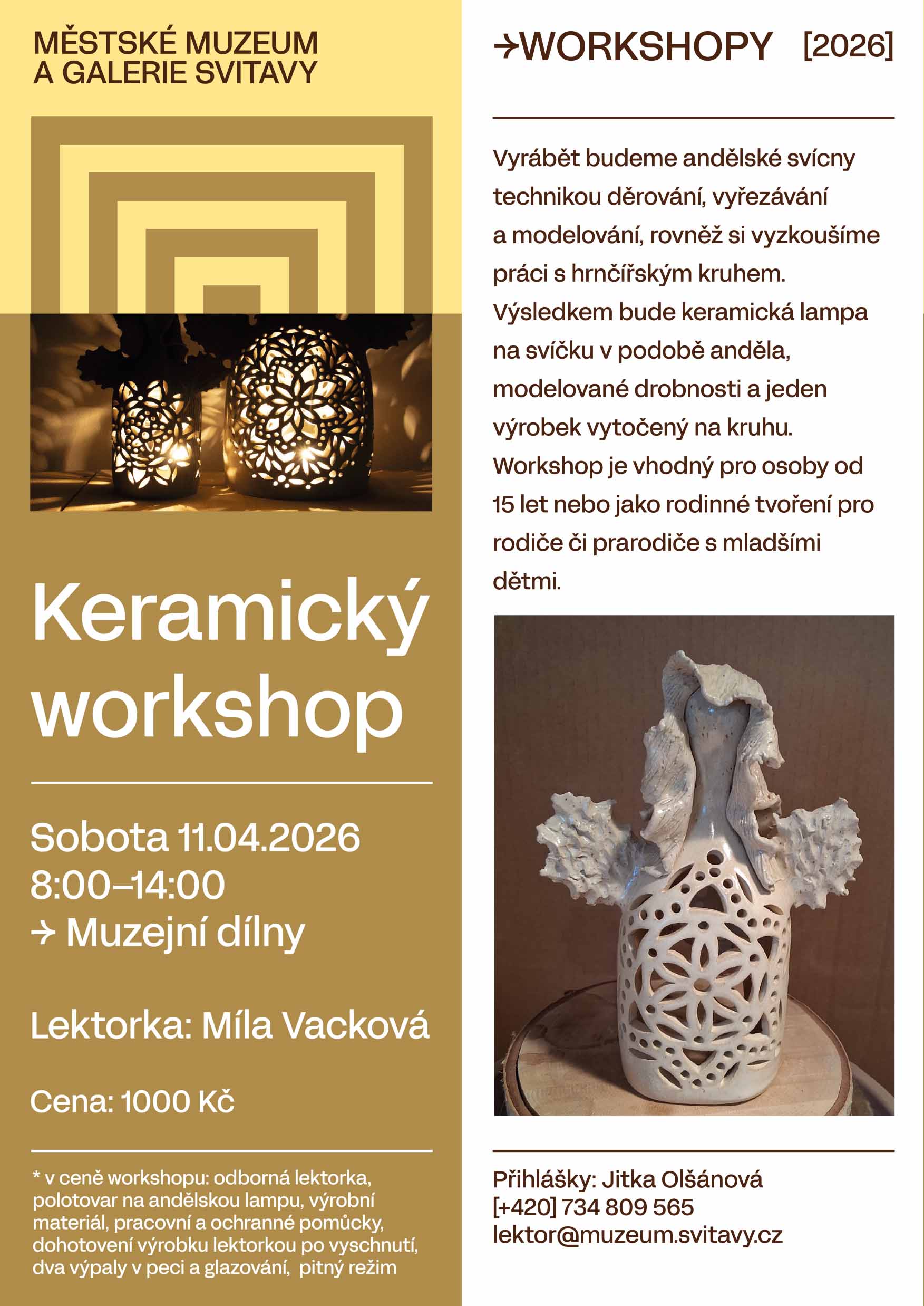 WORKSHOP  KERAMICKÝ-  výroba lampičky v podobě ANDĚLA. 11.4.2026 od 8 do 14 hodin, je určen pro zájemce od 15 let, nebo jako rodinné tvoření pro rodiče, či prarodiče s dětmi do 15let.