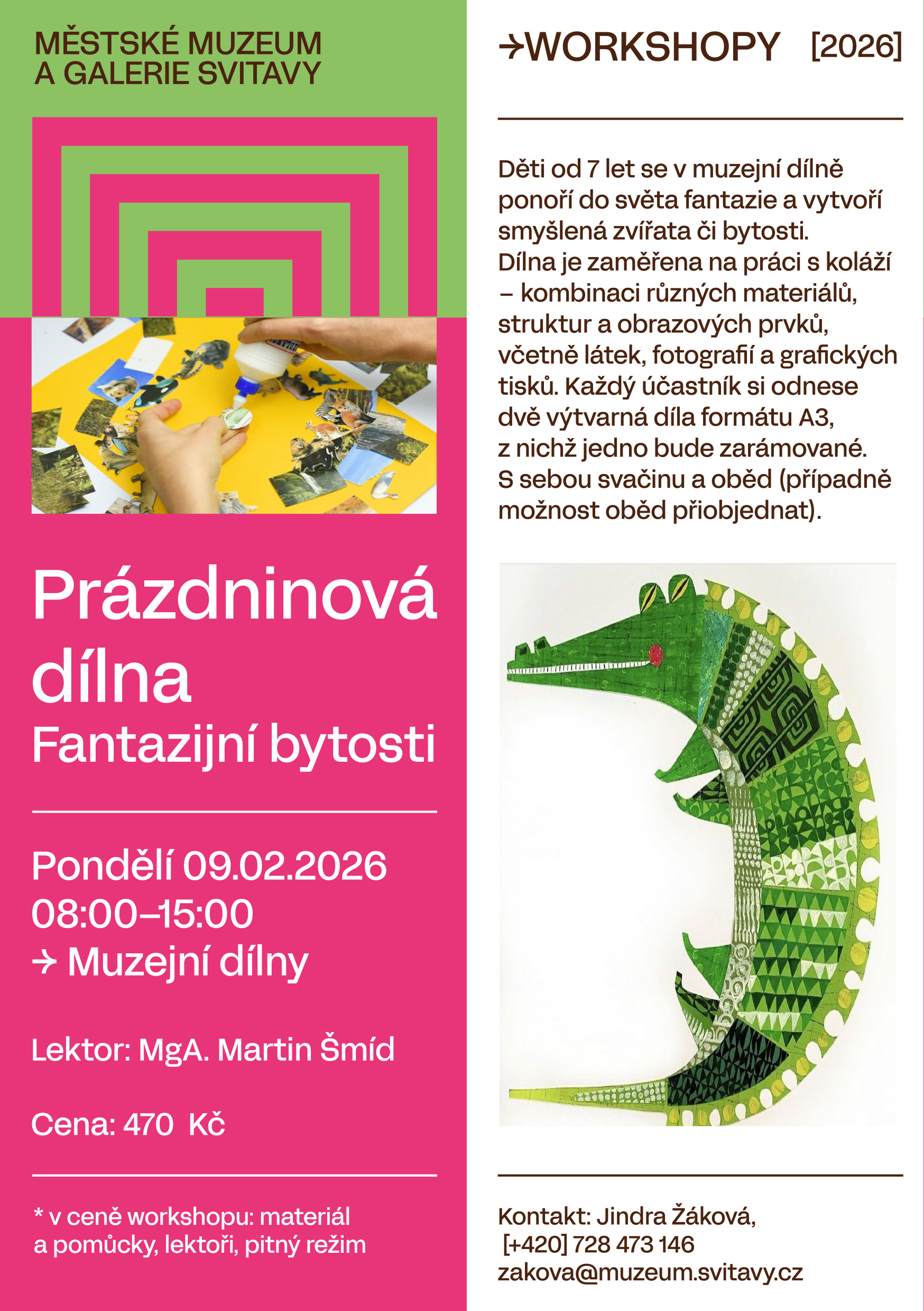 PRÁZDNINOVÝ WORKSHOP  VÝTVARNÝ PRO DĚTI děti budou tvořit bytosti nebo zvířáta dle fantazie s využitím koláže a dalších výtvarných technik. Workshop 9. 2. 2026 od 8 do 15 hodin, je určen pro zájemce od 7 let.