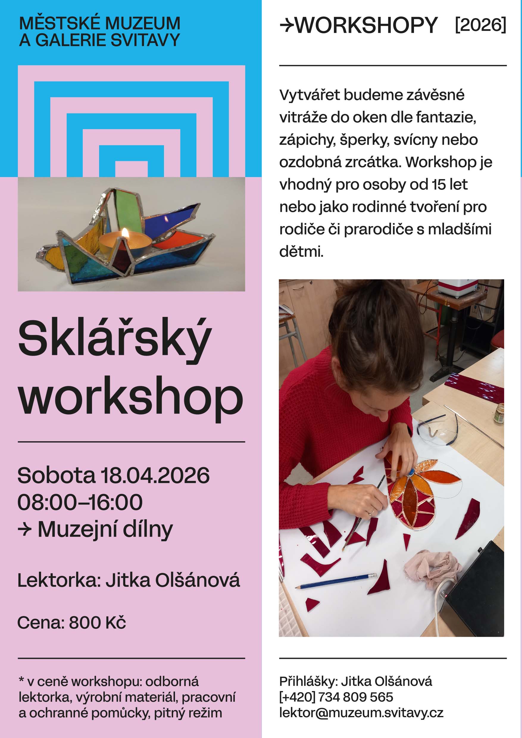 WORKSHOP  SKLÁŘSKÝ - vitráže dle vaší fantazie (k zavěšení na okno, zápichy, šperky, svícny, zrcátka). ?.8.2026 od 8 do 16 hodin, je určen pro zájemce od 15 let.
